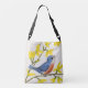 Ce carrosserie tout en imprimé sur le sac est blanc avec un petit oiseau doux bleu et rouge debout sur une branche d'arbre avec de jolies fleurs jaunes à l'avant et à l'arrière.