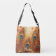 Ce sac fourre-tout vibrant et personnalisé sur le thème de l'automne présente un éventail de plumes de paon détaillées baignées dans la lumière chaude du soleil, entourées de feuilles d'érable qui tombent.
