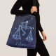 Sac d'impression avec le symbole de Libra en bleu argenté doux, recouvert d'étoiles de la constellation, contre un arrière - plan étoilé du bleu profond de minuit au noir.