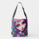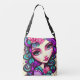 Il s'agit d'un sac carrossable amusant avec une illustration fantaisiste d'une fille en violet, rose et turquoise sur un arrière - plan jaune clair.