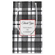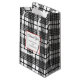 Un sac cadeau modifiable pour petite entreprise ou fête avec écriture et lettres décoratives sur un carré encadré de rouge sur un motif à carreaux horizontaux inspiré du glen noir et blanc avec de fines rayures.