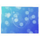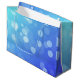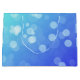 Sac cadeau bleu avec poignées de corde blanche, présentant un motif bokeh numérique de cercles de lumière. Le design crée une atmosphère festive et moderne.
