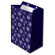 Sac cadeau bleu motif Snowflake. Un motif de flocon blanc décoratif sur un arrière - plan bleu foncé. Il s'agit d'un sac cadeau élégant et classique pour de nombreuses occasions pendant la saison d'hiver, à la fois Noël, Noël et les anniversaires et événements d'hiver. Est disponible en différents modèles et tailles. Enveloppement facile, rapide et luxueux.
