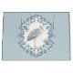 Un sac cadeau Baby shower fantaisiste avec une cigogne grise entourée d'une bordure d'art populaire et d'un arrière - plan gris-bleu. La cigogne a un design d'art folklorique embelli sur son aile en marine, gris, rouge et orange. En dessous du design dit "Welcome Baby" dans une police de caractères bleu. Un motif à points de polka de coordination bleu et gris est utilisé sur les deux côtés de la gusseted et l'envers du sac a la conception de la cigogne.
