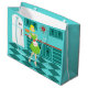 Avec ce sac cadeau Retro Kitchen, vous pouvez avoir votre tarte et le manger, aussi. Ce dessin d'art kitsch et minimaliste présente une femme au foyer des années 50, dans sa cuisine moderne du milieu du siècle. Le beau boulanger porte une robe verte et bondissante et un tablier blanc aux détails rouges. Pas un cheveu sur sa tête blonde n'est déplacé. D'une part, elle tient le fruit de son travail, une magnifique tarte aux fruits surmontée d'un treillis. Un coup d'oeil et vous saurez que ses croûtes de tarte grinçantes sont sans égal. Elle est debout sur un aqua et un damier turquoise, qui est sans aucun doute assez propre pour se nourrir de. Contre un mur d'aqua, on voit une cabane turquoise avec des garnitures d'aqua, un plan rouge, des tiroirs rouges et des accents d'starburst noir. Une horloge rouge d'étoile est suspendue au mur. Sur le côté, on trouve un frigo blanc dernier cri avec poignées en argent. Au moins, le réfrigérateur était à la pointe de la technologie dans les années 1950. Maintenant, c'est juste du rêve ! Que vous soyez Suzie Homemaker ou que vous ayez simplement une affinité pour tout ce qui est vintage, vous êtes sûr d'aimer cette tranche délicieuse d'Americana.