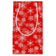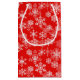 Le sac cadeau en papier est affiché en rouge avec un imprimé fêtes de Noël. Customisez ce sac cadeau ou achetez tel quel.