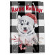Chien Husky avec casquette du Père Noël sur buffle noir et blanc plaid arrière - plan et flocons de neige. Le texte peut être modifié ou supprimé.