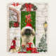 Pekingese Chien Noël assis à l'extérieur de la maison décorée avec la couronne de Noël, le sapin de Noël est une idée cadeau de Noël parfaite pour les amoureux de les chiens.