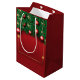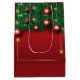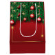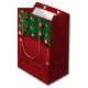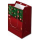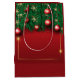 Un sac cadeau festif rouge orné de branches de pin vert et d'ornements rouges brillants. Le sac présente une finition brillante, rehaussant ses couleurs vives. Les poignées sont blanches, offrant un contraste saisissant par rapport à l'arrière - plan rouge riche.