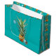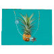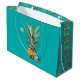 Noël ananas grand sac cadeau en papier. Tropical couleur bleu aqua avec un seul ananas et des ornements sur le devant avec une petite étoile de mer, ou étoile de mer. Un motif d'ananas entoure les côtés et le dos.