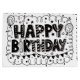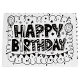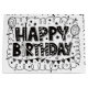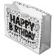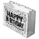Un sac-cadeau blanc avec des lettres noires qui indiquent "Joyeux Anniversaire" et divers gribouillages noirs. Le sac est fait de papier brillant et possède des poignées en corde blanche. Les lettres sont grasses et stylisées, chaque lettre étant remplie de motifs différents tels que des étoiles, des points et des rayures. Les gribouillages comprennent des ballons, des étoiles, des cercles et des lignes ondulées, créant un design festif et célébratoire. Le sac est bien éclairé, mettant en évidence le contraste entre le fond blanc et les graphiques noirs.