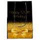 Sac cadeau de fête élégant, classique, glamour et féminin pour une femme de 100 ans. Un ruban doré et un arc à la parties scintillant d'or et scintillant, un peu de bling et de luxe pour un anniversaire. Arrière - plan noir. Texte d'or : Joyeux 100e anniversaire !