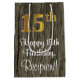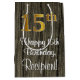 Cette conception sophistiquée, élégante et luxueuse de sac cadeau d'anniversaire comporte un grand numéro ordinal "15ème" avec une imitation/faux motif dégradé de style or, en plus du message de bienvenue d'anniversaire "Happy 15ème anniversaire", et un nom de destinataire personnalisé dans une police de style script. Il possède également un motif arrière - plan d'inspiration imitation bois. Un sac cadeau comme celui-ci peut être une façon amusante d'envelopper un cadeau d'anniversaire ou un cadeau donné à quelqu'un qui célèbre son 15e anniversaire. [~Z0000520]