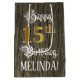 Ce design sophistiqué et luxueux de giftbag d'anniversaire comporte le message "Joyeux 15ème anniversaire", ainsi qu'un nom de destinataire personnalisé. Une partie du message est dans un texte orné de style script, le grand numéro "15th" comporte un motif de look faux/imitation or, et l'arrière - plan a un motif faux/imitation à grains de bois. Un sac cadeau d’anniversaire comme celui-ci pourrait être une façon respectable d’envelopper un cadeau ou un cadeau pour célébrer le quinzième anniversaire de quelqu’un. [~Z0000562]