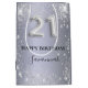 Elégant, classique, glamour et girly pour une fête de 21ème anniversaire. Un arrière - plan métallique argenté. Décoré de poussière de parties scintillant. Personnalisez et ajoutez un nom. Avec le texte : Joyeux anniversaire. Le nom est écrit avec un script de style moderne écrit à la main. Le numéro 21 est écrit avec une police de style ballon.