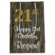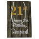 Ce design élégant, élégant et luxueux de giftbag d'anniversaire comprend un grand numéro ordinal "21st" avec une imitation/faux look d'inspiration or, en plus du message de voeux d'anniversaire "Happy 21st Birthday," et un nom de destinataire modifiable dans une police de style script. L'arrière - plan a un motif d'inspiration imitation bois. Un giftbag sophistiqué comme celui-ci pourrait être utilisé pour donner un cadeau ou un cadeau en l’honneur du vingt et unième anniversaire de quelqu’un. [~Z0000520]