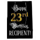 Ce modèle de giftbag orné et fantaisiste d'anniversaire comporte le message "Joyeux 23e anniversaire", ainsi qu'un nom de destinataire personnalisable. Une partie du message est dans un texte élaboré de style script, le grand numéro "23ème" comporte un motif faux/imitation d'inspiration or, et l'arrière - plan est coloré en noir. Un sac cadeau d'anniversaire comme celui-ci peut être une façon respectable d'envelopper un cadeau ou un cadeau qui est donné à quelqu'un qui célèbre son 23e anniversaire. [~Z0000560]