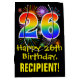Ce giftbag design excitant, coloré et amusant à thème d'anniversaire comprend un grand nombre de "26" avec un motif inspiré par un gradient de spectre arc-en-ciel, avec le message "Happy 26th Birthday," et un nom de destinataire personnalisable. Il dispose également d'un motif arrière - plan coloré inspiré par l'allure d'un feu d'artifice festif. Un sac cadeau comme celui-ci pourrait être utilisé pour envelopper des cadeaux donnés à quelqu'un pour célébrer son vingt-sixième anniversaire. [~Z0000509]