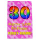 Ce modèle de sac cadeau amusant, optimiste et amoureux à thème d'anniversaire comporte un grand nombre de "30" avec un motif inspiré par un gradient de spectre arc-en-ciel, ainsi que le message "Happy 30th Birthday," et un nom de destinataire personnalisé. Il possède également un joyeux arrière - plan aux formes cardiaques roses dans un motif rayé. Un joyeux sac cadeau comme celui-ci peut être utilisé pour donner un cadeau ou un cadeau en l’honneur du trentième anniversaire de quelqu’un. [~Z0000511]
