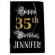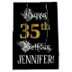 Ce design de giftbag fantaisie et luxueux, sur le thème de l'anniversaire, comprend le message "Happy 35th Birthday", ainsi qu'un nom de destinataire personnalisable. Une partie du message est dans un texte opulent de style script. Le grand numéro "35th" présente un motif d'allure imitation or. L'arrière - plan est noir de couleur. Un sac cadeau d'anniversaire comme celui-ci peut être une façon respectable d'envelopper un cadeau ou un cadeau qui est donné à quelqu'un qui célèbre son 35e anniversaire. [~Z0000560]