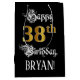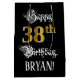 Ce luxueux et opulent design de giftbag sur le thème de l'anniversaire comporte le message "Joyeux 38e anniversaire", ainsi qu'un nom de destinataire personnalisé. Une partie du message est dans un texte de style script sophistiqué, le grand numéro "38th" présente un faux/imitation motif de look d'inspiration or, et l'arrière - plan est coloré en noir. Un sac cadeau d’anniversaire comme celui-ci pourrait être une façon respectable d’envelopper un cadeau ou un cadeau pour célébrer le 38e anniversaire de quelqu’un. [~Z0000560]