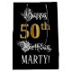 Ce design élégant et luxueux de giftbag à thème d'anniversaire comprend le message "Joyeux 50e anniversaire", ainsi qu'un nom de destinataire personnalisé. Une partie du message est dans un texte élaboré de style script. Le grand numéro "50th" présente un motif de look imitation or. L'arrière - plan est noir de couleur. Un sac cadeau d’anniversaire à thème comme celui-ci peut être utilisé pour offrir un cadeau ou un cadeau pour célébrer le 50e anniversaire de quelqu’un. [~Z0000560]