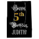 Ce giftbag design opulent et élégant comporte le message "Joyeux 5e anniversaire", ainsi qu'un nom de destinataire personnalisé. Une partie du message est dans un texte de style script luxueux, le grand numéro "5th" dispose d'un faux/imitation motif d'apparence d'inspiration or, et l'arrière - plan est coloré en noir. Un sac cadeau d’anniversaire comme celui-ci pourrait être une façon respectable d’envelopper un cadeau ou un cadeau pour célébrer le 5e anniversaire de quelqu’un. [~Z0000560]