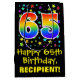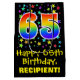 Ce modèle de sac cadeau dynamique, coloré et passionnant à thème d'anniversaire comporte un grand nombre de "65" avec un motif de style dégradé de spectre arc-en-ciel, ainsi que le message "Happy 65th Birthday," et un nom de destinataire personnalisable. Il dispose également d'un motif arrière - plan aux formes étoiles de différentes tailles et couleurs. Un sac cadeau comme celui-ci peut être utilisé pour envelopper les cadeaux donnés à quelqu'un pour célébrer son soixante-cinquième anniversaire. [~Z0000510]
