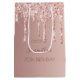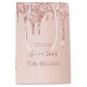 Un sac cadeau pour un 70ème anniversaire féminin et glamour. Un arrière - plan d'or faux rose avec une élégante parties scintillant d'or faux rose gouttes, peinture goutte à goutte. Le texte : Le nom est écrit en or rose foncé avec un script de style manuscrit moderne. Tempérer pour une date et l'âge 70.