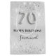 Soirée élégante, classique, glamour de 70e anniversaire. Un arrière - plan métallique argenté. Décoré de poussière de parties scintillant. Personnalisez et ajoutez un nom. Avec le texte : Joyeux anniversaire. Le nom est écrit avec un script de style moderne écrit à la main. Le numéro 70 est écrit avec une police de style ballon.