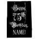 Ce modèle de sac cadeau d'anniversaire formel et élégant comporte le message "Happy 75th Birthday", en texte de style script luxueux, sur un arrière - plan de couleur noire. Il comporte également un nom de destinataire personnalisé. Un sac-cadeau comme celui-ci pourrait être une façon respectable d'envelopper un cadeau d'anniversaire ou un cadeau donné à quelqu'un qui célèbre son soixante-quinzième anniversaire. [~Z0000557]