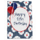 Fleurs blanches aux centres rouges sur tissu en jean bleu et ballons pour 80ème anniversaire. L'âge peut être changé.