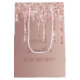Un sac cadeau pour un 80e anniversaire féminin et glamour. Un arrière - plan d'or faux rose avec une élégante parties scintillant d'or faux rose gouttes, peinture goutte à goutte. Le texte : Le nom est écrit en or rose foncé avec un script de style manuscrit moderne. Tempérer pour une date et l'âge 80.