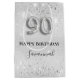 Soirée élégante, classique, glamour de 90ème anniversaire. Un arrière - plan métallique argenté. Décoré de poussière de parties scintillant. Personnalisez et ajoutez un nom. Avec le texte : Joyeux anniversaire. Le nom est écrit avec un script de style moderne écrit à la main. Le numéro 90 est écrit avec une police de style ballon.