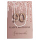 Elégant, classique, glamour et girly pour une fête de 90ème anniversaire. or rose et rose vif, arrière - plan dégradé. Décoré d'or rose, de gouttes de parties scintillant rose, de la peinture goutte à goutte. Personnalisez et ajoutez un nom. Avec le texte : Joyeux anniversaire. Le nom est écrit avec un script de style moderne en lettres de couleur rose foncé. Le numéro 90 est écrit avec une police de style ballon.
