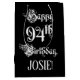 Ce sac cadeau d'anniversaire opulent et orné est doté du message "Joyeux 94e anniversaire", en texte de style script, sur un arrière - plan de couleur noire. Il a également un nom de destinataire personnalisé. Un sac-cadeau à thème d'anniversaire comme celui-ci pourrait être une façon respectable d'envelopper un cadeau ou un cadeau qui est donné à quelqu'un qui célèbre son 94e anniversaire. [~Z0000557]