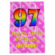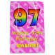 Ce modèle de sac cadeau d'anniversaire amusant, joyeux et amusant comporte un grand nombre de "97" avec un motif de style dégradé de spectre arc-en-ciel, ainsi que le message "Happy 97th Birthday", et un nom de destinataire personnalisable. Il a aussi un coeur rose optimiste et raye motif arrière - plan. Un joyeux sac cadeau comme celui-ci pourrait être utilisé pour envelopper les cadeaux donnés à quelqu'un pour célébrer son 97e anniversaire. [~Z0000511]