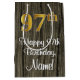 Ce design élégant, élégant et luxueux de sac cadeau d'anniversaire comprend un grand numéro ordinal "97th" avec un look faux/imitation or, en plus du message de voeux d'anniversaire "Happy 97th Birthday", et un nom de destinataire modifiable dans une police de style script. Il possède également un motif arrière - plan d'inspiration imitation bois. Un sac cadeau d'anniversaire comme celui-ci pourrait être une façon amusante d'envelopper un cadeau ou un cadeau donné à quelqu'un qui célèbre son quatre-vingt-dix-septième anniversaire. [~Z0000520]