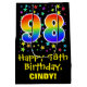 Ce modèle de sac cadeau d'anniversaire passionnant, dynamique et coloré comporte un grand nombre de "98" avec un motif de style dégradé de spectre arc-en-ciel, ainsi que le message "Happy 98th Birthday," et un nom de destinataire personnalisé. Il dispose également d'un motif arrière - plan aux formes étoiles de différentes tailles et couleurs. Un sac cadeau d'anniversaire comme celui-ci peut être une façon amusante d'envelopper un cadeau ou un cadeau qui est donné à quelqu'un qui célèbre son 98e anniversaire. [~Z0000510]