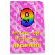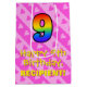 Ce giftbag à thème d'anniversaire optimiste, amoureux et amusant comporte un grand nombre de "9" avec un motif inspiré par un gradient de spectre arc-en-ciel, ainsi que le message "Happy 9th Birthday," et un nom de destinataire personnalisé. Il possède également un joyeux arrière - plan aux formes cardiaques roses dans un motif rayé. Un joyeux sac cadeau comme celui-ci pourrait être utilisé pour envelopper des cadeaux donnés à quelqu'un pour célébrer leur neuvième anniversaire. [~Z0000511]