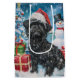 Ce design festif reflète l'esprit joyeux de la période des fêtes, avec un adorable petit portant un chapeau de Père Noël. Le chien est niché dans un pays des merveilles hivernales, avec un bonhomme de neige, un sapin de Noël décoré et des cadeaux joliment emballés. Les flocons de neige tombent doucement, ajoutant une touche magique à la scène, tandis que les couleurs vives des décorations de vacances créent une atmosphère chaleureuse et joyeuse.