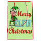 Joyeux Noël Elfin. Cet elfe de Père Noël drôle et dur voudrait que tu aies un joyeux Noël. En fait, il insiste là-dessus. Ce sac-cadeau montre un elfe de vacances en colère à côté des mots "Joyeux Noël Elfin" fait en lettres bleues rouges et glacées cursives. L'elfe sautait en l'air, cliquait sur ses talons, agitait le poing et fumait une cigarette. Le arrière - plan est vert pâle avec des bouquets de neige blancs. C'est un jeu de mots humoristique pour quiconque pense "bah humbug" pendant les vacances. Le design apparaît des deux côtés du sac cadeau.