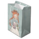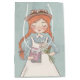 Ce sac cadeau Anne of Green Gables présente notre bien-aimée Anne avec un E portant une robe marron sous un tablier blanc. L'arrière - plan est bleu pâle avec un peu de pénible. Les couleurs sont marron, vert sauge, bleu pâle, jaune, orange, rose et blanc. À l'arrière du sac cadeau, la vue arrière de la tête d'Anne est présentée.