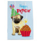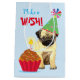 Joyeux voeux d'anniversaire avec ce design mignon avec un chiot en Carlin souriant et portant le casquette de fête avec un cupcake d'anniversaire. "Joyeux Anniversaire" devant et "Faites un voeu !" derrière. Le texte peut être facilement changé; il suffit de cliquer sur le bouton personnaliser.