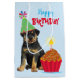 Joyeux salutations d'anniversaire avec ce design mignon avec un joli chiot Rottweiler portant un casquette de fête avec un cupcake d'anniversaire. "Joyeux Anniversaire" devant et "Faites un voeu !" derrière. Le texte peut être facilement changé; il suffit de cliquer sur le bouton personnaliser.
