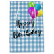 Aqua bleu et blanc en vichy vérifier le motif avec le texte de Joyeux Anniversaire et le bouquet de ballons coloré. Le texte peut être modifié ou supprimé. La taille du motif en vichy peut être augmentée ou diminuée.