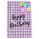 Lavande violet et blanc en vichy vérifier motif avec Happy Birthday texte et ballon bouquet. Le texte peut être modifié ou supprimé. La taille du motif en vichy peut être augmentée ou diminuée.