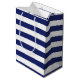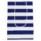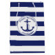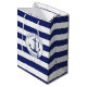 Ce sac orienté nautique de cadeau a une ancre de bleu marine avec une frontière circulaire de corde et un arrière - plan rayé de bleu marine et blanc. Le texte de bleu marine au-dessus de l'ancre lit le "joyeux anniversaire". Le texte ci-dessous est un nom pour que vous personnalisiez.