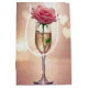 Une délicate rose émerge d'une flûte de champagne remplie de liquide mousseux, sertie contre un arrière - plan rêveur aux formes de coeur douces et brillantes. Le texte peut être modifié.