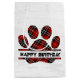 Empreinte de patte de animal de compagnie en plaid rouge et noir avec un texte d'anniversaire heureux sur du bois peint blanc passé. Le texte est modifiable.
